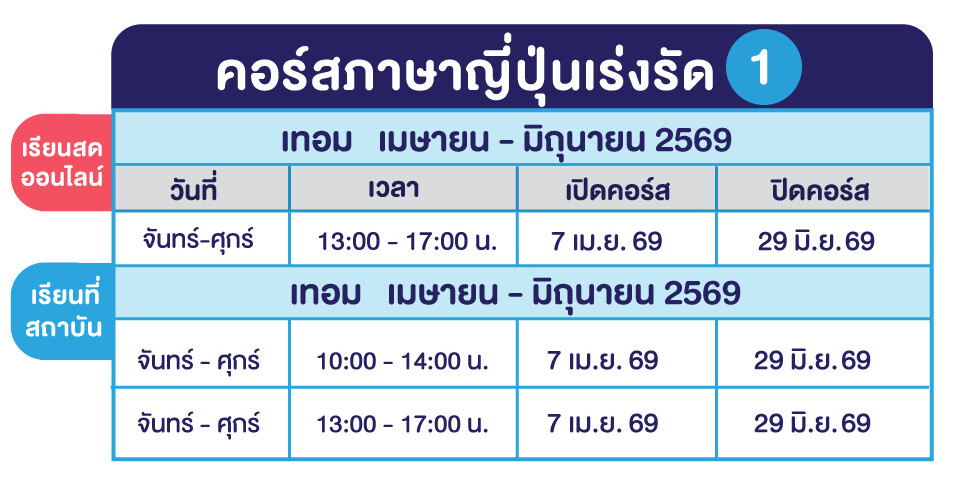 **จบแล้วสามารถต่อคอร์สภาษาญี่ปุ่นเร่งรัด 2 หรือคอร์สเรียนภาษาญี่ปุ่นทั่วไประดับ Intermediate 1 ของเจเซ็นเตอร์ได้เลย**